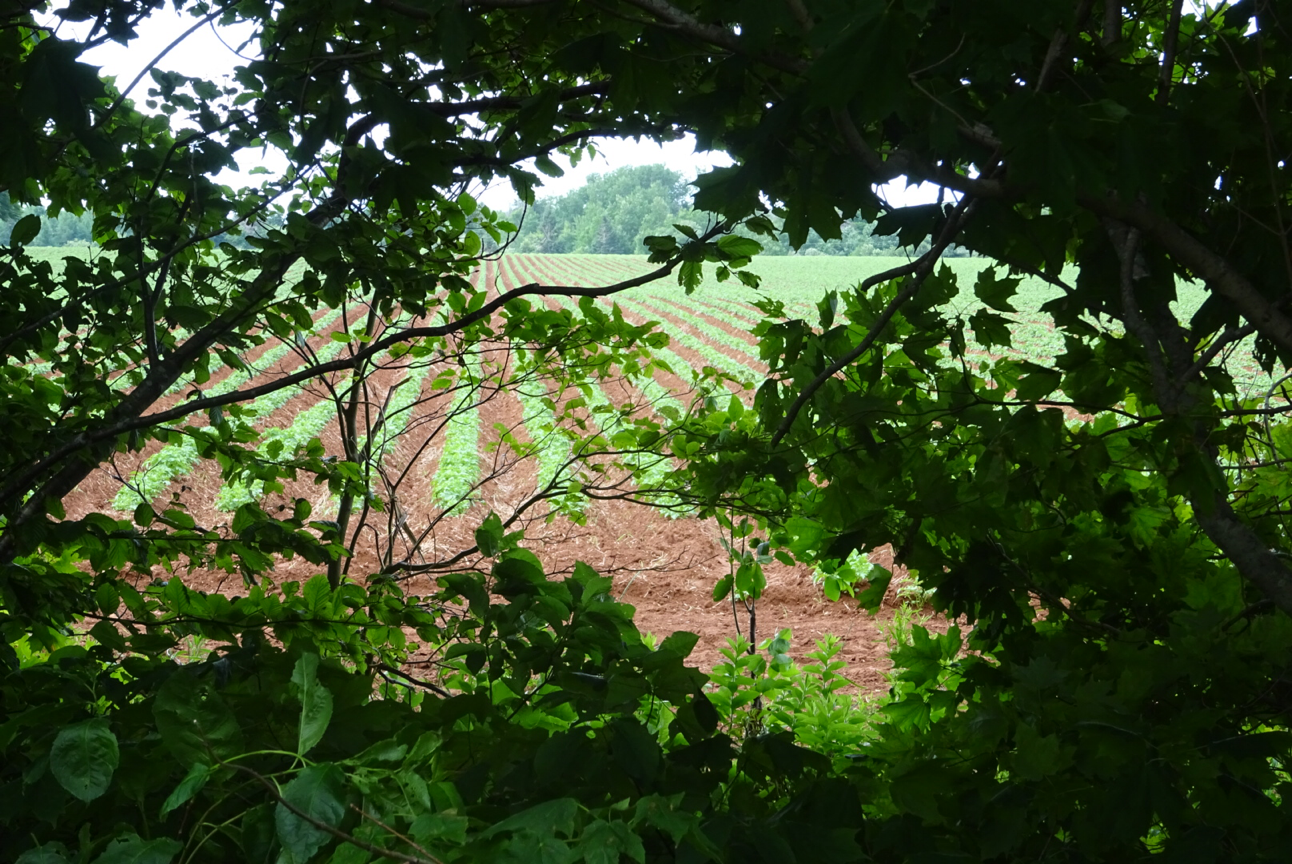 There are several sections of the trail with gaps in the trees so you can see the fields. Looking out into the wheat field, there was a spraying machine,