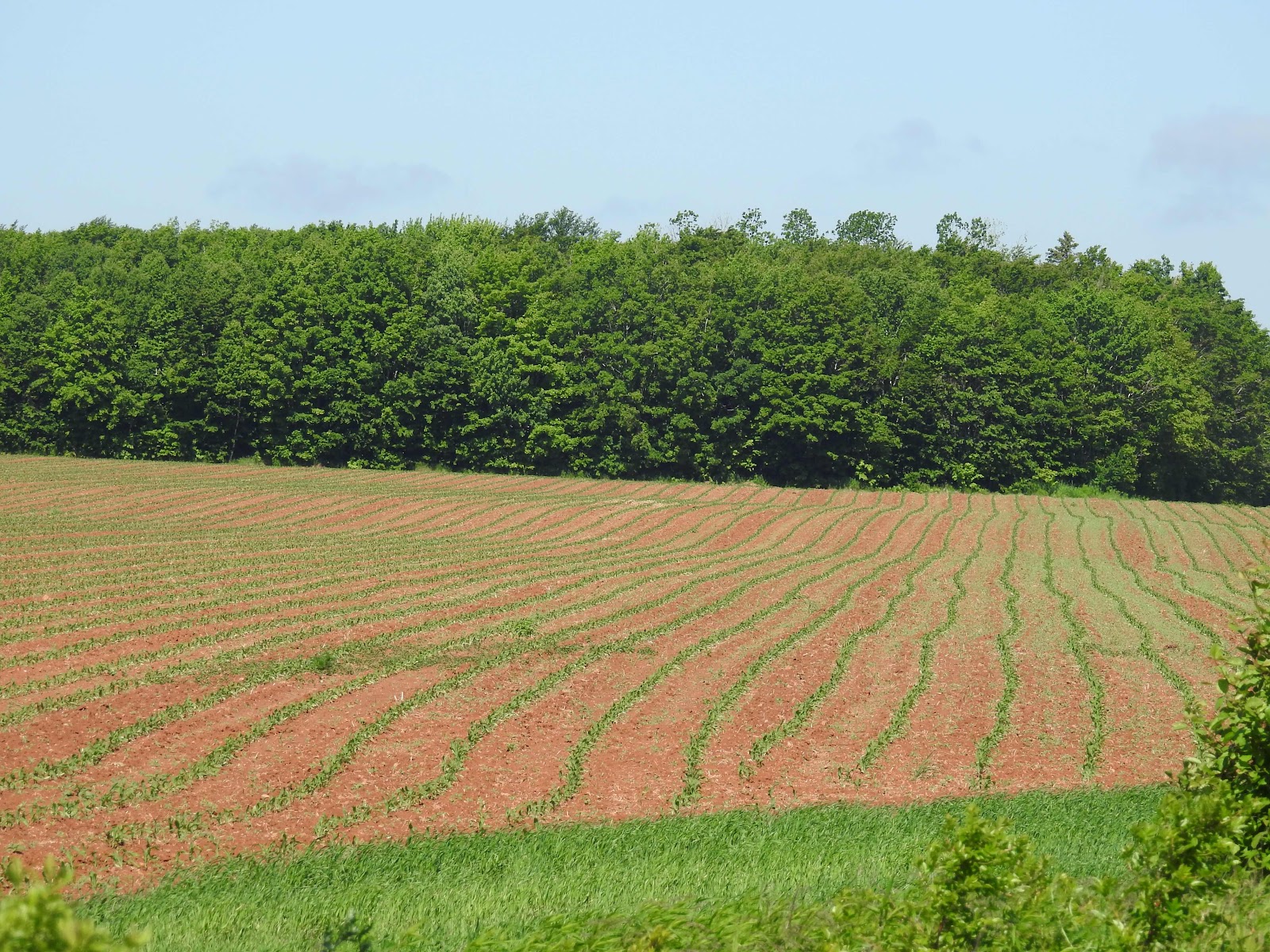 The Confederation Trail on Prince Edward Island travels mainly through the centre of the island, an area which is farmland. Industrial farms and remaining family farms come into view as we ride the Trail. Fields sometimes appear to go on forever as they stretch over the countryside. Now crops are beginning to emerge from the rich red soil.