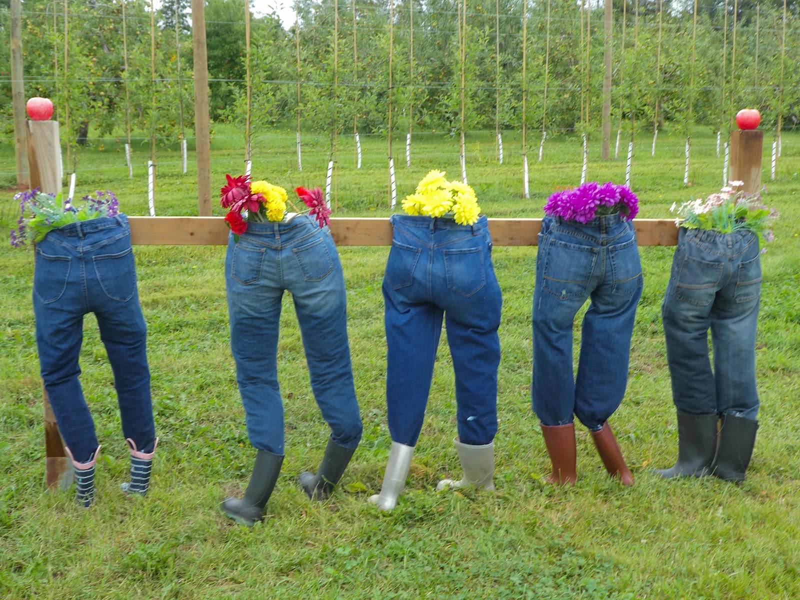 What great fall photos! Blue jeans as planters is such a darling idea. I haven’t been to an apple orchard in ages. I really need to hit up the local pumpkin patch, and other such places this year. It’s still in the low 90s here, although it is supposed to cool off. No trees are changing, so to me it still feels like summer. Thanks for the touch of fall.